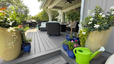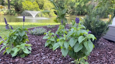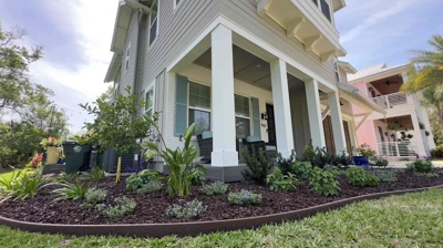 First, let’s step into the vibrant front yard. We see a complete makeover with sweeping flower beds bursting with color. These beds feature Blue Daze, Lobelia, and Salvia – all excellent perennials for our warm Atlantic Beach climate. These beauties will bloom throughout the season, adding a constant touch of cheer.