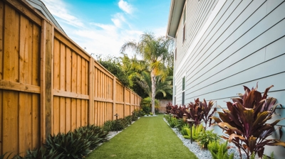 The client desired a striking, contemporary tropical oasis that would draw the eye to the home while also being orderly and easy to maintain. They also required necessary details such as an extra parking space and accessibility for children and dogs to play. The flowing bed lines of coquina and granite, with lush plantings provide color and texture year-round and create a tropical framework to the clean artificial turf and shell pavers.